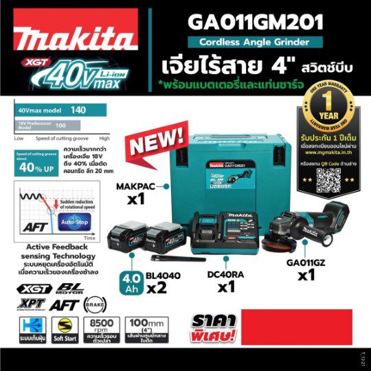 MAKITA เครื่องเจียไร้สาย 40 โวลต์ ขนาด 4 นิ้ว รุ่น GA011GM201 ความเร็วรอบตัวเปล่า 8,500 รอบ/นาที สวิตซ์บีบ รวมแบตเตอรี่และแท่นชาร์จ (มากีต้า)