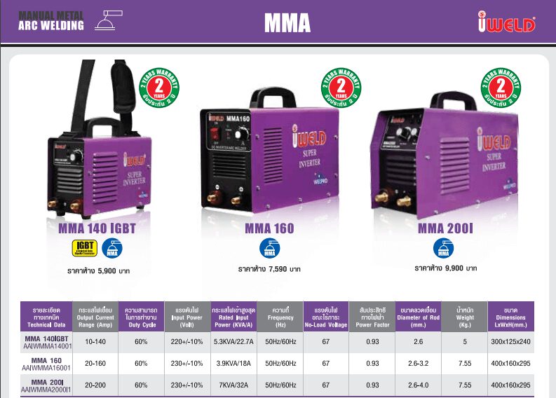 - Duty Cycle60% ,สายเชื่อมที่ยาวถึง 6 เมตร ,กระแสเชื่อมคงที่แม้ในสภาวะไฟตกไฟเกิน ,มีระบบป้องกัน ความเสียหายของเครื่อง (OC)