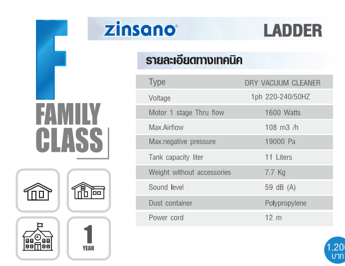Home / Shop / เครื่องมือทำความสะอาด / ZINSANO / ZINSANO เครื่องดูดฝุ่น / เครื่องดูดฝุ่นไฟฟ้า LADDER DRY 11L VACUUM