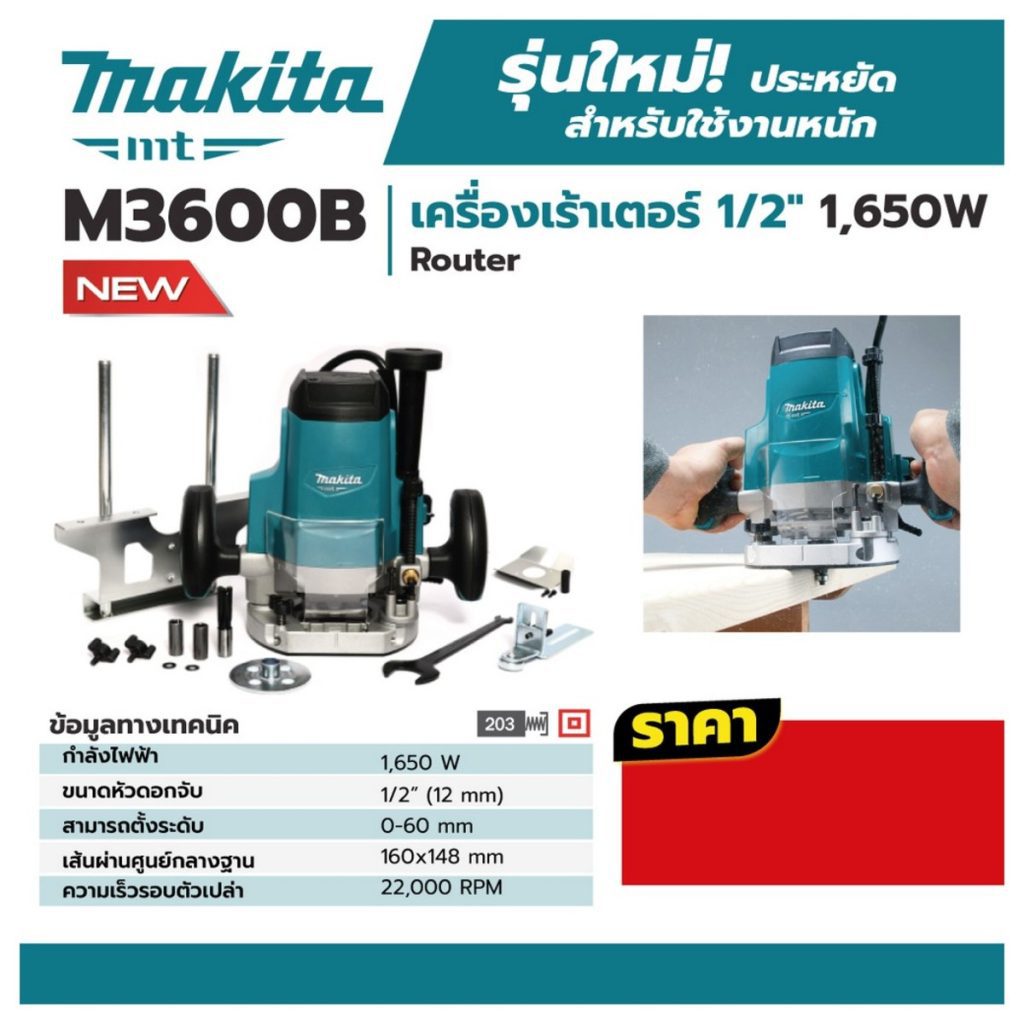 MAKITA เครื่องเร้าเตอร์ ขนาด 1/2 นิ้ว (12 มม.) กำลังไฟ 1,650 วัตต์ รุ่น M3600B ความเร็วรอบตัวเปล่า 22,000 รอบ/นาที ปรับความเร็วได้ (มากีต้า)