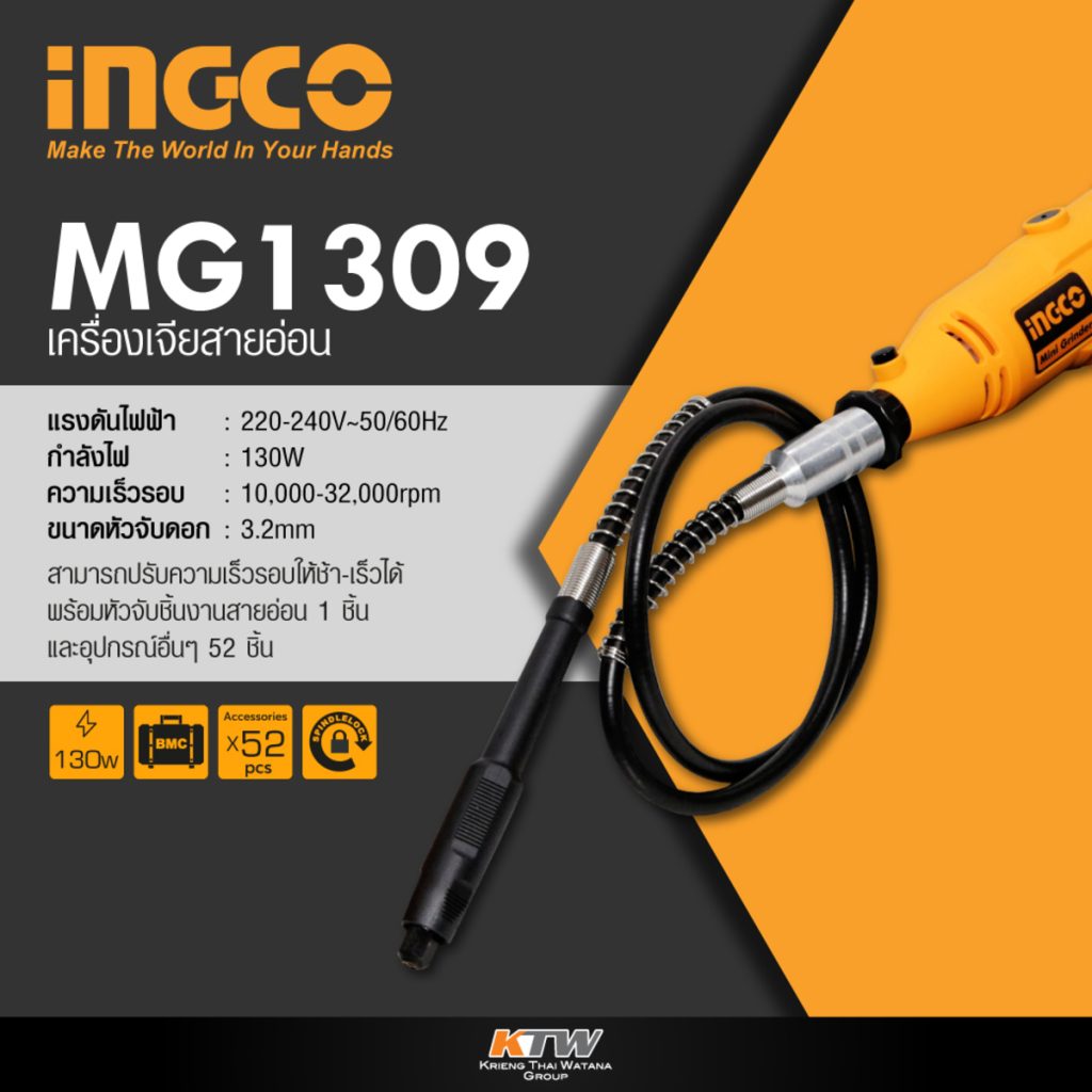 INGCO เครื่องเจียสายอ่อน กำลังมอเตอร์ 130 วัตต์ รุ่น MG1309 แรงดันไฟ 220-240 โวลต์ ความเร็วรอบตัวเปล่า 10,000 – 32,000 รอบ/นาที (อิงโก)