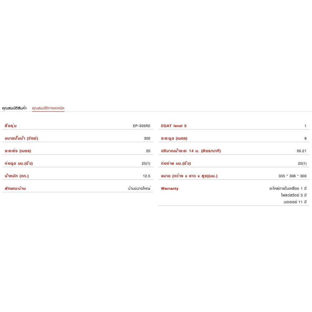 MITSUBISHI ปั๊มน้ำอัตโนมัติแรงดันคงที่ รุ่น EP-305R2 ขนาด 300 วัตต์ ระยะดูด 8 เมตร ระยะส่ง 20 เมตร ขนาดท่อ 25 มม. ปริมาณน้ำ 62 ลิตร/นาที (สูงสุด), 53 ลิตร/นาที (ระยะ 12 เมตร) สำหรับบ้าน 2-3 ชั้น จุดที่ใช้น้ำ 1-7 จุด (มิตซูบิชิ)