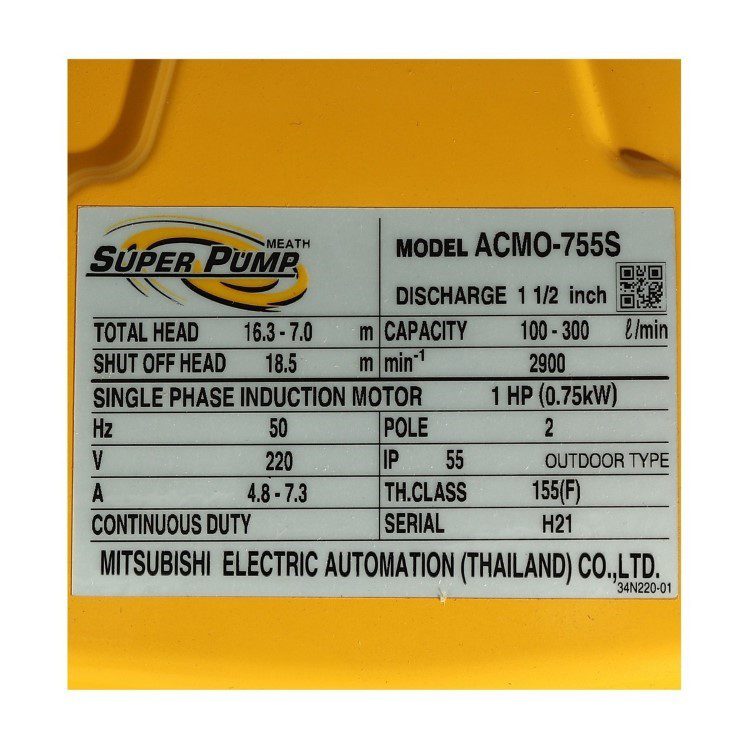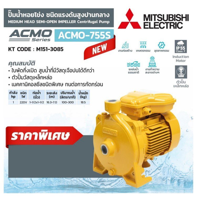 ปั๊มน้ำหอยโข่ง ชนิดแรงดันสูงปานกลาง ใบพัดกึ่งเปิด มิตซูบิชิ (MITSUBISHI) รุ่น ACMO-755S