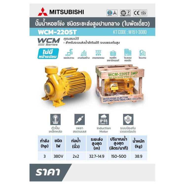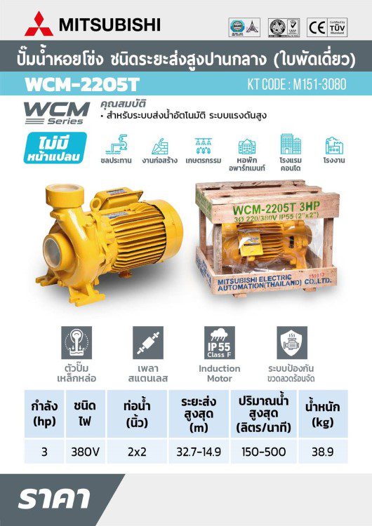ปั๊มน้ำหอยโข่ง ชนิดแรงดันสูงปานกลาง มิตซูบิชิ (MITSUBISHI) รุ่น WCM-2205T