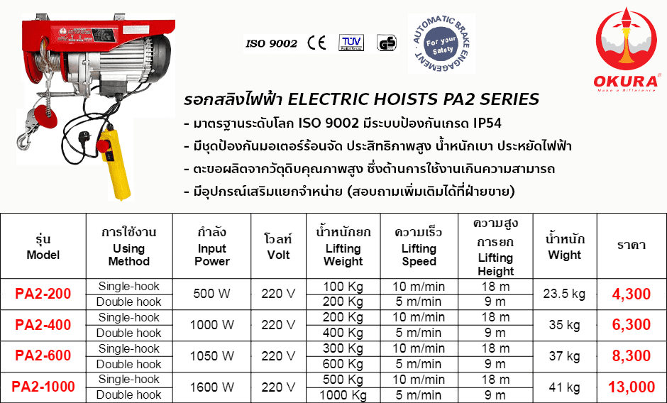 OKURA รอกสลิงไฟฟ้า รุ่น PA2-1000