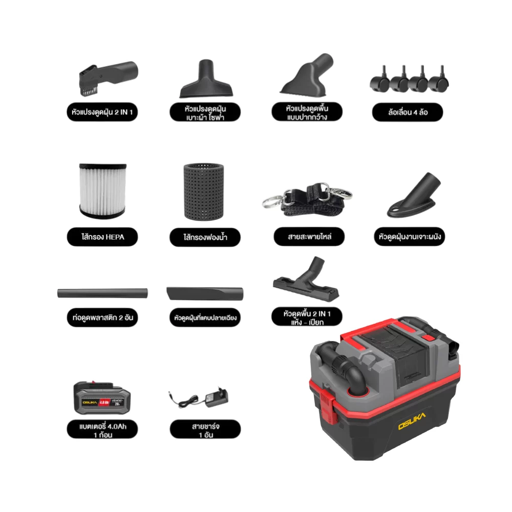 🔺ฟรีหัวดูดครบชุด, หัวดูด 4 แบบ ทั้งหัวดูดพื้น หัวดูดฝุ่นรูสว่าน หัวดูดโซฟา และหัวซอกมุม 2in1, All-in-One Nozzle Kit