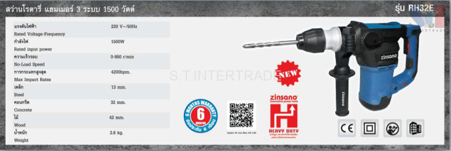 ZINSANO – สว่านโรตารี่ แฮมเมอร์ 3 ระบบ 1500 วัตต์ รุ่น RH32E