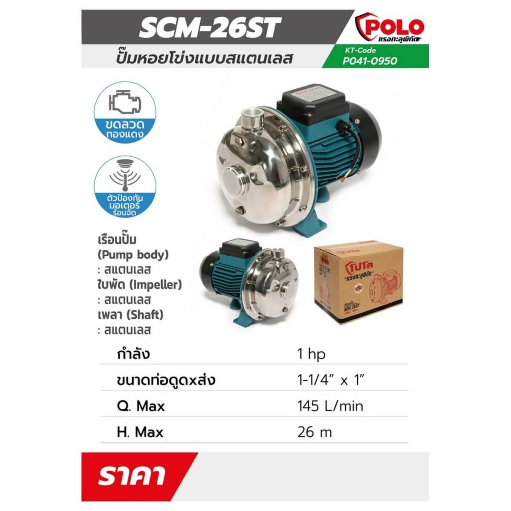 POLO ปั๊มหอยโข่งสแตนเลส รุ่น SCM-26ST มอเตอร์ 1 แรงม้า ขนาดท่อ 1-1/4 นิ้ว X 1 นิ้ว ปริมาณน้ำสูงสุด 145 ลิตร/นาที ส่งสูง 26 ม. (โปโล)