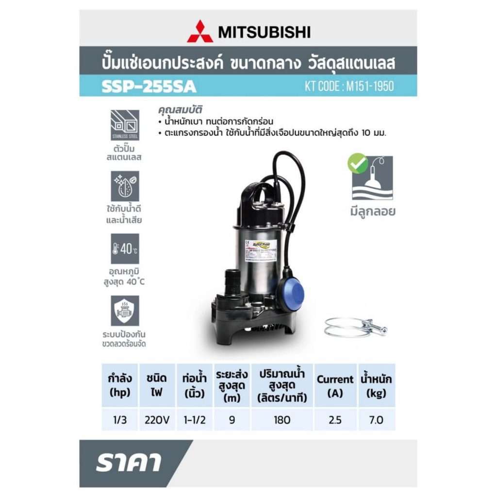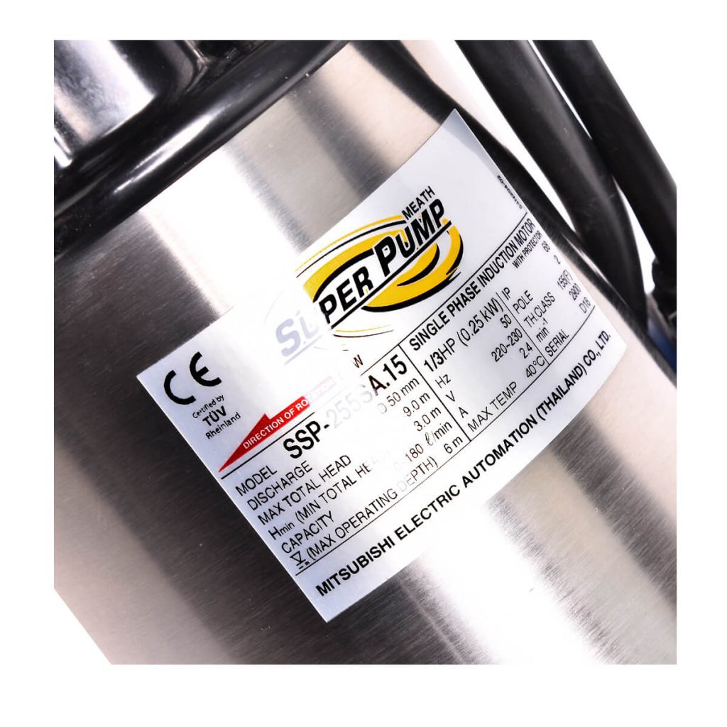 MITSUBISHI ปั๊มแช่สแตนเลส ชนิดมีลูกลอยรุ่น SSP-255SA กำลัง 1/3 แรงม้า ขนาดท่อ 1 1/2 นิ้ว ไฟ 220V ระยะส่งสูงสุด 9 เมตร ปริมาณน้ำสุงสุด 180 ลิตร/นาที สำหรับสูบส่งน้ำ (มิตซูบิชิ)