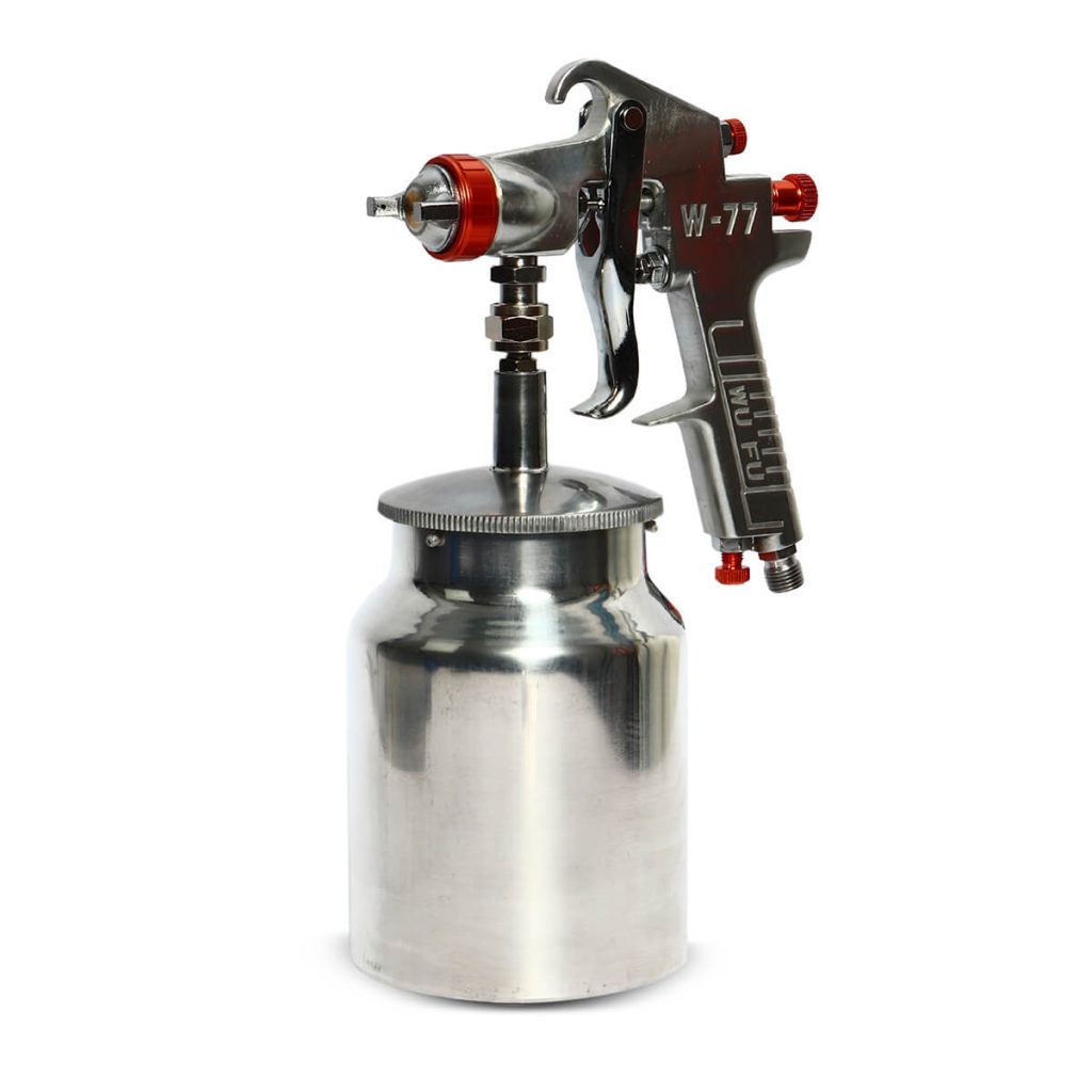 WUFU กาพ่นสี กาล่าง+กระป๋อง รุ่น W-77S ขนาดหัวฉีด 1.5 มม. ความจุถ้วยสี 1000 มล. ปริมาณสี 130-220 มล./นาที แรงดันใช้งาน 50 PSI สายลม 1/4 นิ้ว ละอองฝอย สเปรย์ละเอียด สม่ำเสมอ ต่อเนื่อง (วูฟู)