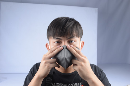 - ปรับแถบโลหะด้วยนิ้วชี้และนิ้วกลางของมือทั้งสองข้าง ให้เข้ารูปกับสันจมูกเพื่อให้แน่ใจว่าหน้ากากอนามัยแนบสนิทเป็นอย่างดี