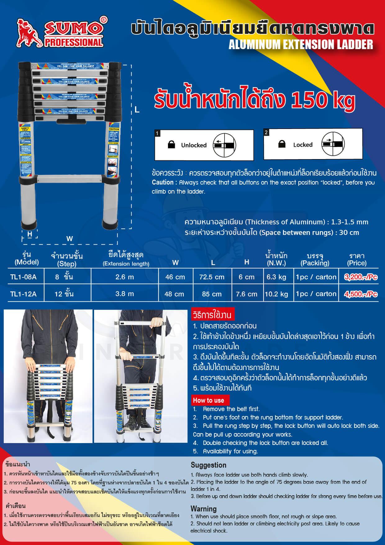 - บันไดอลูมิเนียมยืดหด ทรงพาด 12 ขั้น ปรับยืดได้สูงถึง 3.8 เมตร