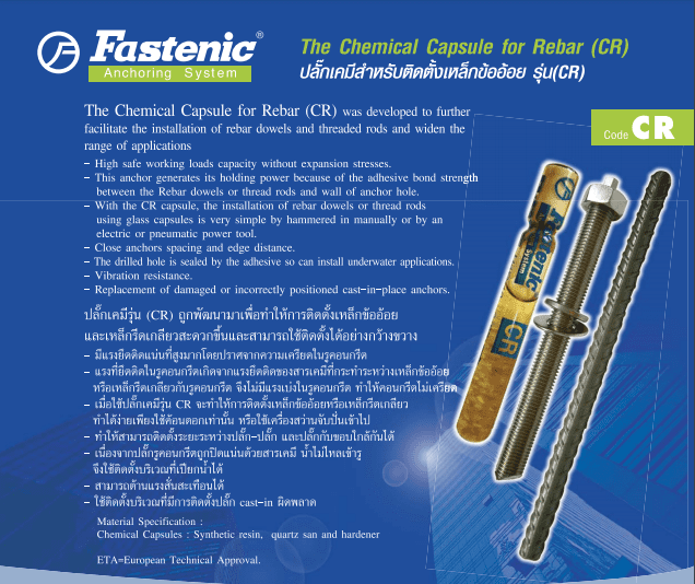 - เมื่อใช้ปลั๊กเคมีรุ่น CR จะทำให้การติดตั้งเหล็กข้ออ้อยหรือเหล็กรีดเกลียว ทำได้ง่ายเพียงใช้ค้อนตอกเท่านั้น หรือใช้เครื่องสว่านจับปั่นเข้าไป