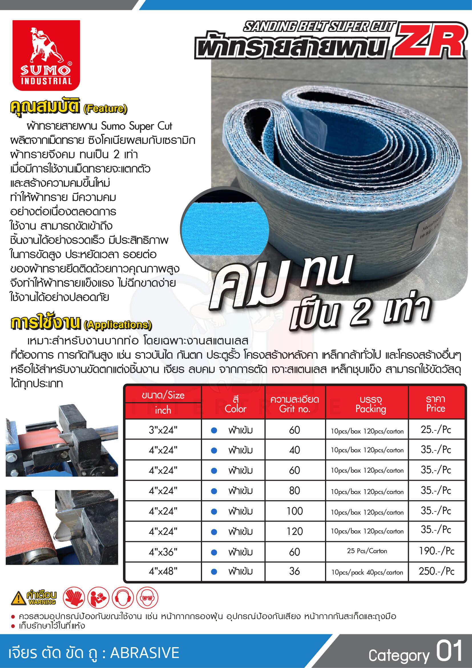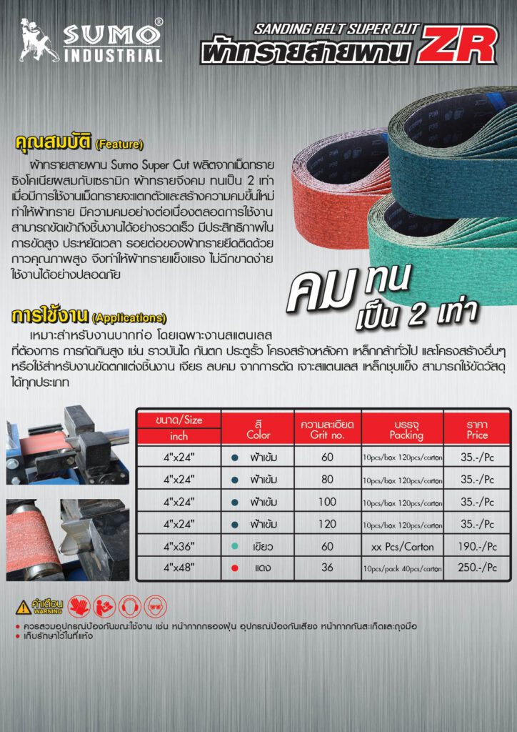 ผ้าทรายสายพาน Sumo Super Cut ผลิตจากเม็ดทราย ซิงโคเนียผสมกับเซรามิก ผ้าทรายจึงคม ทนเป็น 2 เท่า