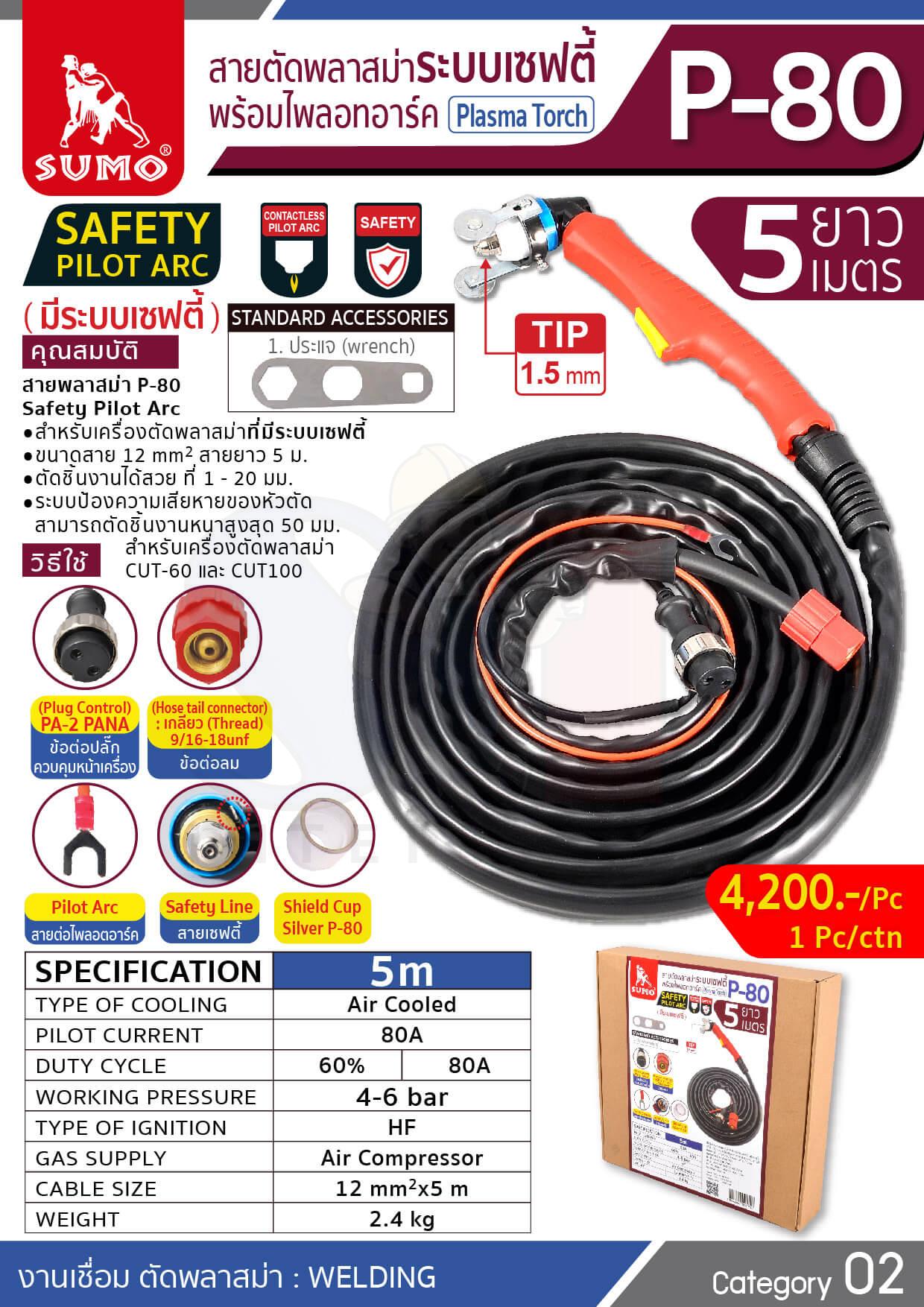 สายพลาสม่า P-80 Safety Pilot Arc (ยาว 5M) ใช้งานกับ เครื่องตัดพลาสม่า CUT-60 และ CUT-100 สำหรับเครื่องตัดพลาสม่าที่มีระบบเซฟตี้